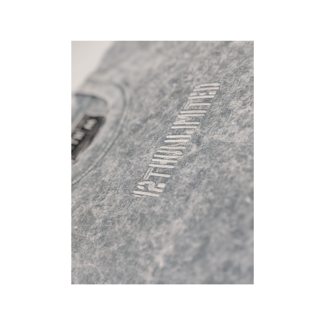 Drop top oversize para mujer en tono gris con acabado acid wash. Inspirada en la pizarra envuelta en niebla, esta prenda evoca la sutileza y misterio de los paisajes urbanos.